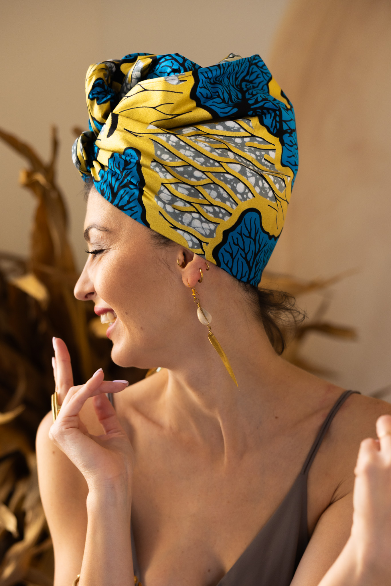 Chusta na afrykański arykański Turban Safari wykonany z materiału 100% bawełny o mocnym splocie, barwionym metodą wax printing. Dzięki najwyższej gatunkowo tkaninie produkt jest niezwykle wytrzymały i sprawdzi się o każdej porze roku. Materiał we wzory afrykańskie!