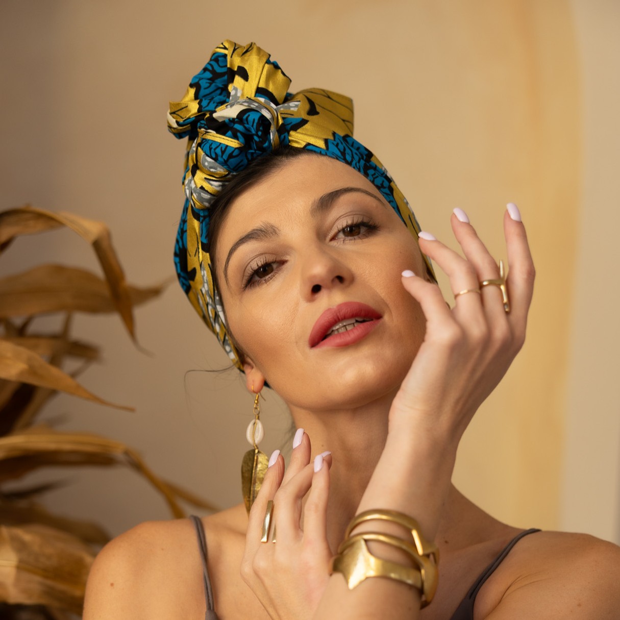 Chusta na afrykański Turban afrykański wykonana z materiału 100% bawełny o mocnym splocie, barwionym metodą wax printing. Dzięki najwyższej gatunkowo tkaninie produkt jest niezwykle wytrzymały i sprawdzi się o każdej porze roku. Materiał we wzory afrykańskie!